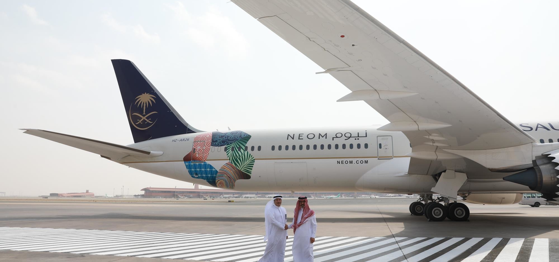 دشنت الخطوط السعودية شعار "نيوم" على إحدى طائراتها للتحليق به حول العالم، بهدف التعريف بالمشروع الأكثر طموحًا على مستوى العالم، الذي يقدم نموذجًا لما يجب أن تكون عليه مدن المستقبل، ويمثل موطنا للابتكارات وألمع العقول في بيئة محفزة على التميز والإبداع.