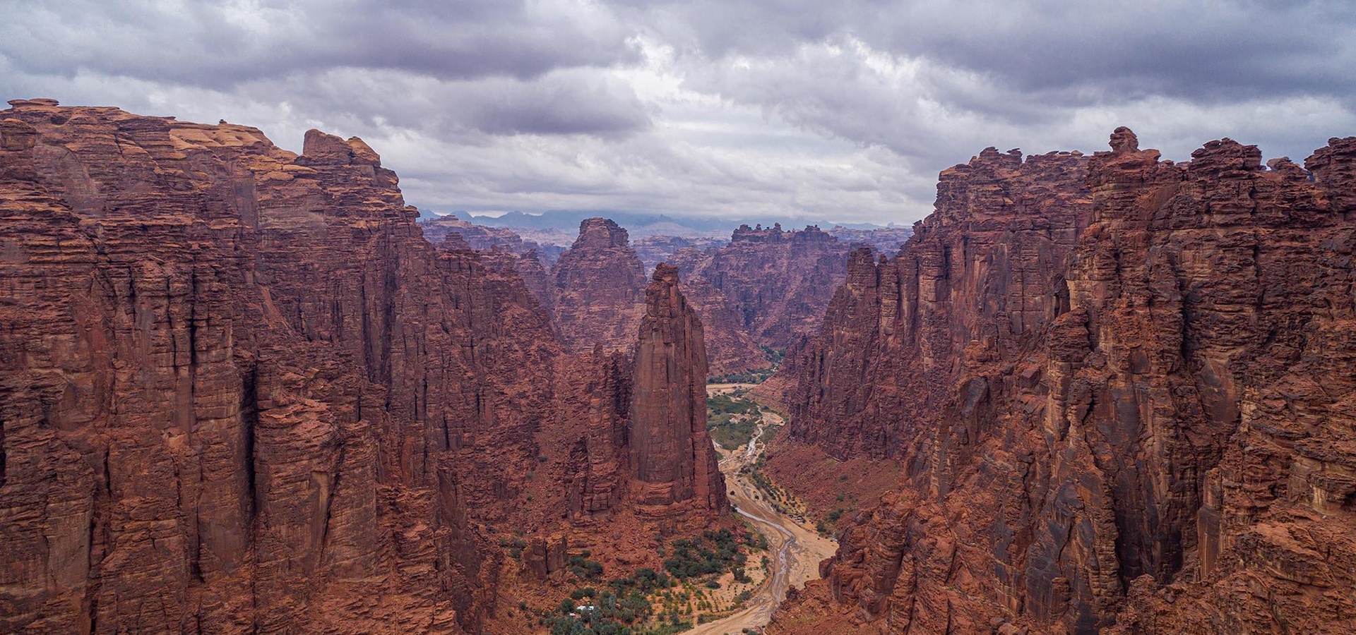 الطريق المعبدة التي يسلكها الزوار في رحلتهم إلى القرية تنتهي مع الوصول إلى الموقع المقصود. هناك حيث تستقبل الزوار الجبال الشاهقة على الجانبين فيضطرون إلى القيادة على جداول مياه غير عميقة بسياراتهم متجاوزين الحشائش في بعض المناطق الضيقة التي لا تلبث أن تنتهي مع الدلوف إلى أفق أكثر رحابة وسط الوادي حيث تنتشر أشجار النخيل التي تعانق الجبال على الجانبين.