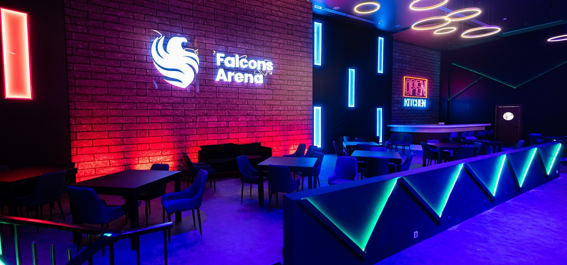 وتحتضن المنطقة الأولى فالكونز أرينا عددًا من بطولات الألعاب الإلكترونية ومقابلة مؤثري وصانعي المحتوى المفضّلين لديهم من فريق فالكونز، إلى جانب عروض الطهي كأحد فعاليات الفريق الجانبية. ويُضاف إلى ذلك، منطقة حي فالكونز التي تضم متجرًا لمعجبي فريق فالكونز والألعاب الإلكترونية ومركزًا للعب بأقوى أجهزة الحاسب الشخصي، ومتحفًا يستعرض جميع الإنجازات التي حققها فريق فالكونز، وأكاديمية "تعلّم لتُصبح محترفًا"، ومنطقة البث المباشر التي يرتادها فريق فالكونز للبث عبر قنواتهم.