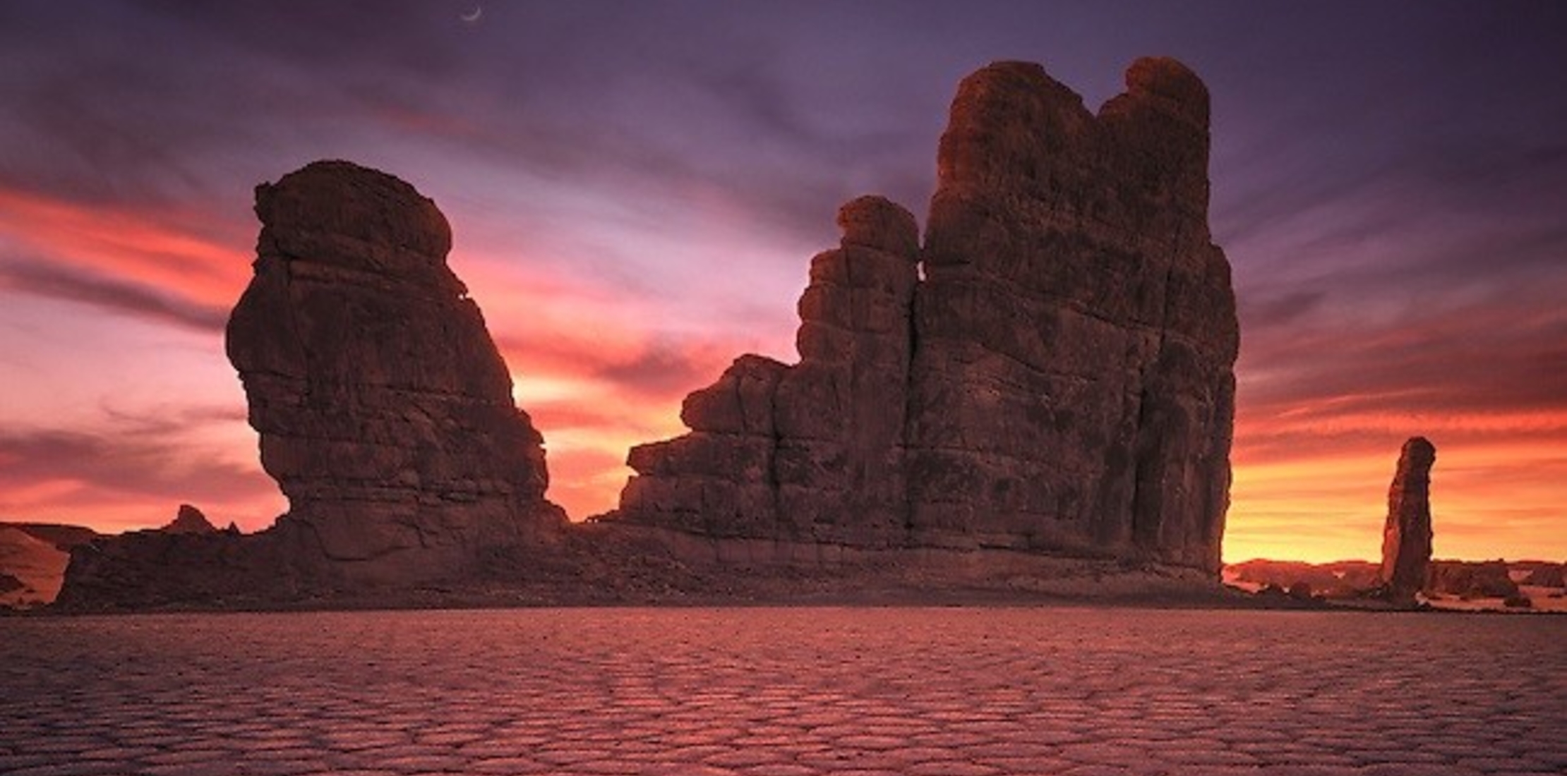 كثيرًا ما تجتمع التضاريس الغرائبية مع غروب الشمس في منطقة تدعى قاع الصنيع في منطقة برية من محافظة العلا، لتشكل ترفا مبهرًا من الصعب تجاوز منظره.