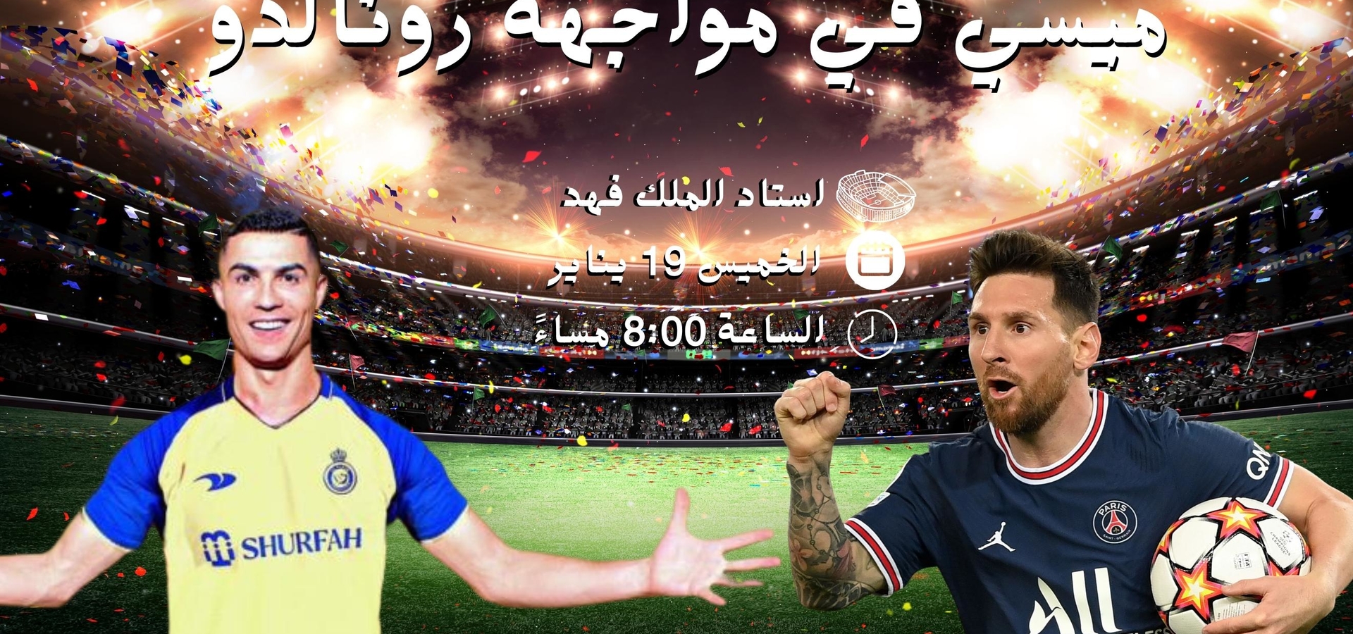 ينتظر عشاق كرة القدم بشغف المواجهة الجديدة التي تجمع نجمي كرة القدم العالميين كريستيانو رونالدو وليونيل ميسي، عندما يلتقيان في المباراة التي يخوضها نجوم الهلال والنصر بقيادة رونالدو الذي اختير لحمل شارة الكابتن وقيادة فريق نجوم موسم الرياض السعودي أمام نادي باريس سان جيرمان الذي يضم كوكبة من نجوم العالم وعلى رأسهم ميسي ونيمار وكيليان إمبابي.